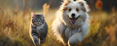 Joyful dog and cat group playing in a blurred field background. Concept Pet Photography, Blurred Backgrounds, Animal Portraits, Playful Pets, Joyful Moments