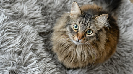 Adorable cat looking up with bright eyes as it sits on a fluffy rug
