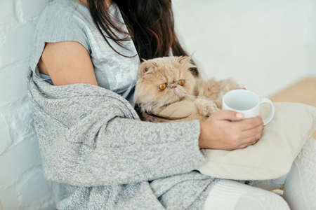 dark-haired girl with a cat in her arms, at home in the bedroom on the bed