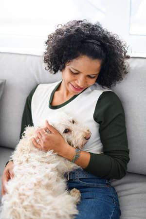Smiling female of varied heritage hugging a dog in an inclusive environment