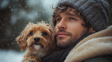Man Holding Small Dog, Both Enjoying Snowfall in a Serene Winter Landscape Surrounded by Trees. Generative AI