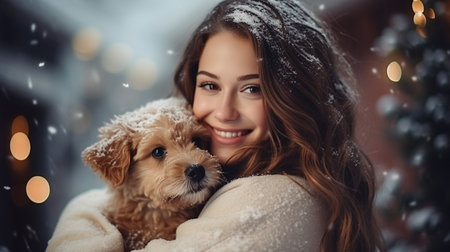 Beautiful woman holding a puppy with a warm christmas decor. Cosy gold and red decor