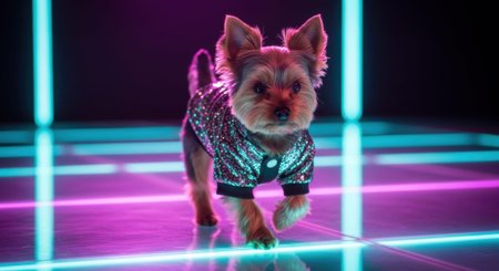 Adorable dog in glittering costume on neon lit dance floor for halloween fun.