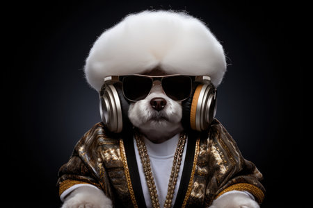 Bichon Frize Dog Dressed As A Rapper On Black Background. Сoncept Pet Fashion Trends, Bichon Frise Breed, Pet Outfits, Rappers Hip Hop Culture.