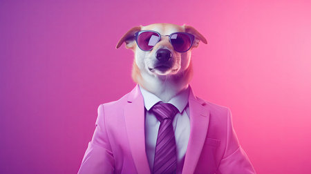 A stylish dog wearing a pink jacket and sunglasses poses charmingly against a vibrant pink background. Perfect for pet fashion, lifestyle, and cheerful themes.