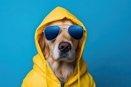 Golden retriever wearing blue hoodie and sunglasses against yellow studio background showcasing fash
