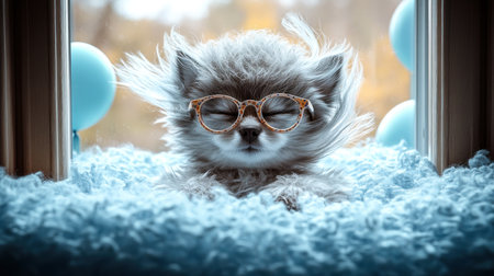 A fluffy kitten wearing stylish glasses enjoys a peaceful moment by a sunny window.