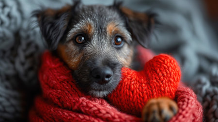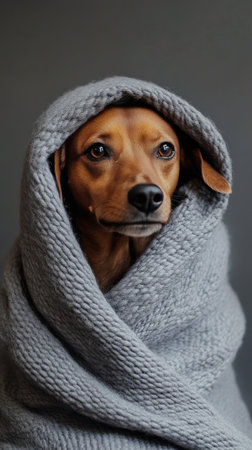A dog sits calmly while wrapped in a soft gray blanket, eyes reflecting a serene and contemplative mood. The indoor setting suggests a cold winter day, enhancing the cozy atmosphere.