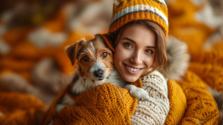 A joyful woman wearing a knitted hat and sweater, cuddling her cute Jack Russell Terrier, both cozy in autumn attire.