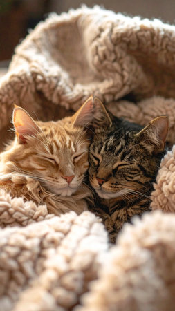 A cat is sleeping in a blanket. The cat is curled up and has its eyes closed. The blanket is soft and fluffy, providing a comfortable place for the cat to rest. Concept of warmth and relaxation