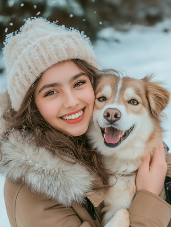 A girl with a dog on the background of a winter landscape, a girl smiling