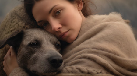 Portrait of a beautiful young woman with a dog in her arms.
