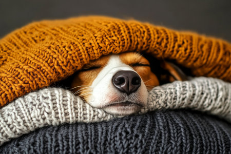 A relaxed dog enjoys a warm nap, completely enveloped in a knitted sweater, resting on a soft blanket. The atmosphere is cozy and inviting, perfect for a lazy afternoon.