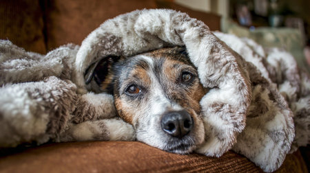 A Jack Russell terrier lies cozy and content under a fluffy blanket on a couch, exuding warmth and tranquility in a softly lit living room setting.