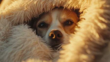 A dog rests on a soft bed surrounded by warm light and cozy textures, enjoying a moment of comfort in a tranquil setting.