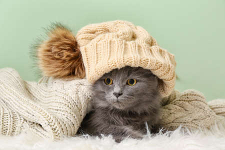Cute cat with knitted hat under warm plaid on color background. Concept of heating season