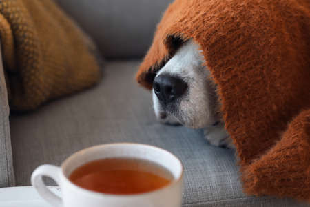 A dog of breed German shepherd covered with a blanket. Selective focus.
