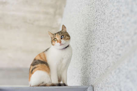 single young cat, wait and sit on a table in the outdoor
