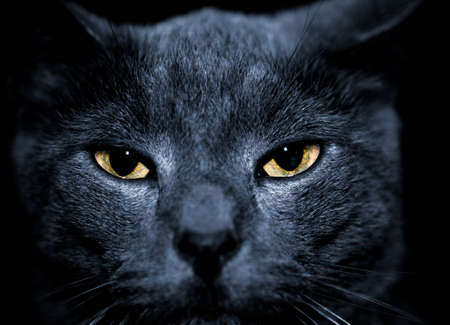 Portrait of a gray cat with glowing eyes