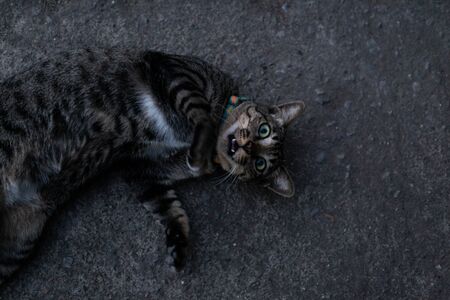 High angle portrait of cat sitting on street and meows to the camera.