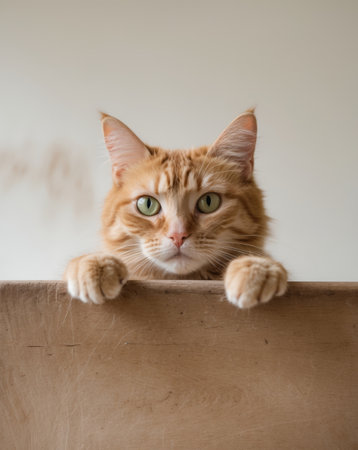 AI Generated. Curious ginger cat peeking over wooden cutting board with paws