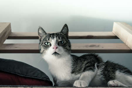 Cute tabby cat lying on bed at home. Adorable pet