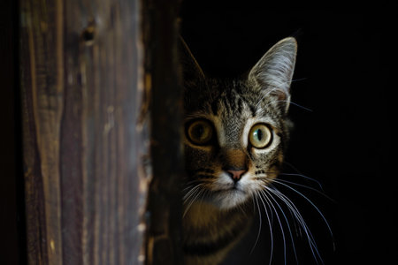A tabby cat with green eyes peers out from behind a wooden door, its whiskers twitching with curiosity. The dark background creates a sense of mystery and intrigue.