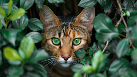 Tabby Cat Hiding Among Green Leaves.