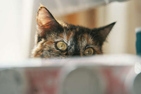 Cute kitten with yellow eyes looks away. Fluffy cat peeks out from behind object. Pets and lifestyle concept. Domestic animal themes. Curious multicolored pussycat is lying on desktop.