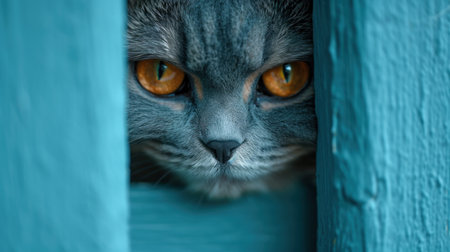 Close-up portrait of a gray cat with orange eyes looking out of a blue wall