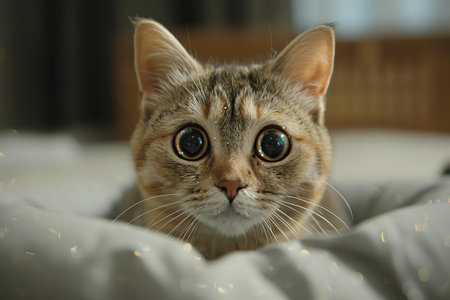 A curious cat looks intently at the camera with wide, surprised eyes in a softly lit indoor space, capturing a moment of wonder.