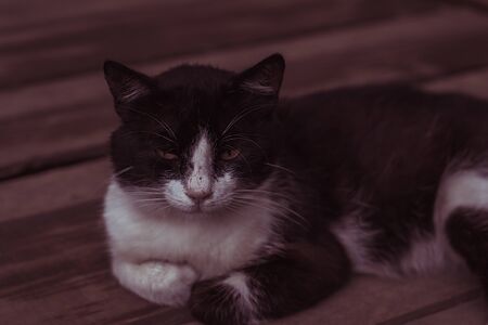 Black with white street cat lying on the wooden floor