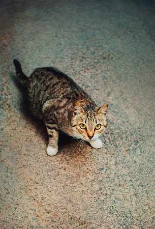 A cute stray tabby cat, standing on the pavement with a frightened expression. Animal welfare and the struggles faced by stray animals in urban environments.