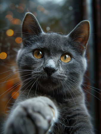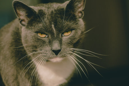 Portrait of a charming gray domestic cat with a long mustache. A lovely pet.