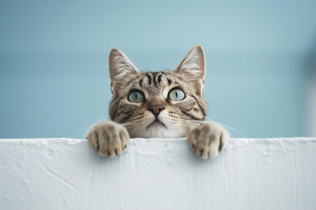 Cute cat peeking out of the white wall, blue background