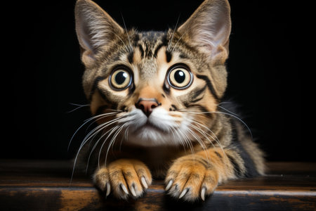 Tabby cat crawling on dark surface with cinematic lighting