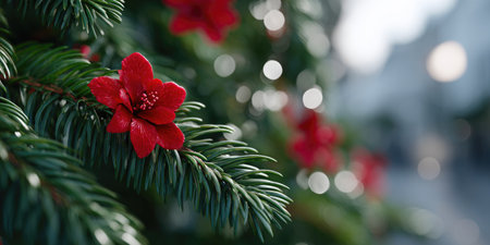 Red Flower Blooming on Pine Tree Branch
