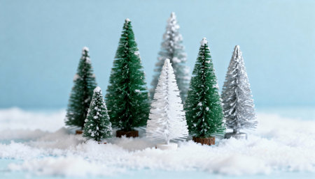 Miniature fir trees dusted with snow sit on a snowy surface against a soft blue backdrop with ample empty area for text and seasonal messaging, evoking winter holiday mood and tabletop display