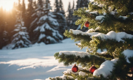 Decorated Christmas tree in the snow. Sunny winter New Year's Eve landscape. High quality illustration
