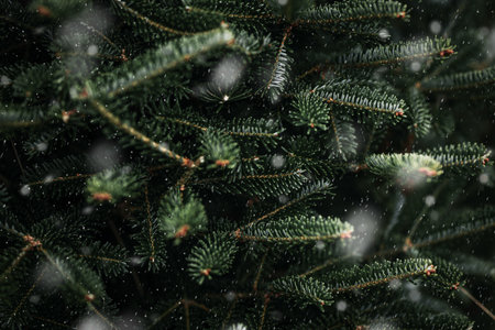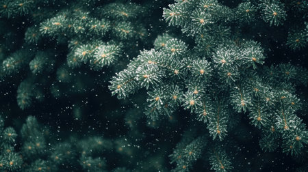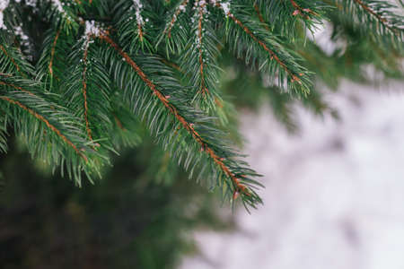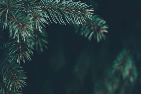 Beautiful Christmas wallpaper background. Fir-tree brunches close up. Frosty green pine tree. New Year theme with copy space for your text
