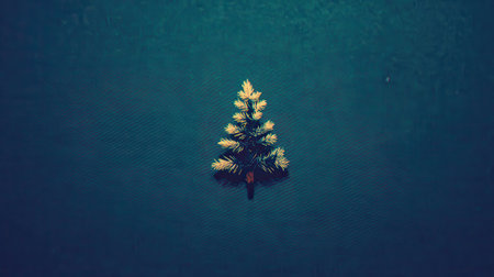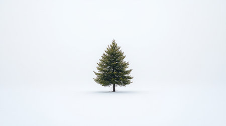 A single, vibrant green evergreen tree, perfectly shaped, stands alone in a vast, untouched expanse of white snow, symbolizing resilience and natural beauty.