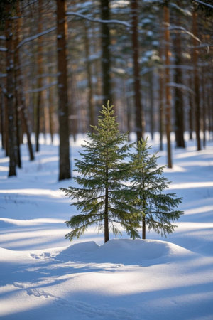 Two green pines in a winter forest