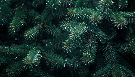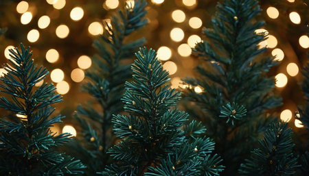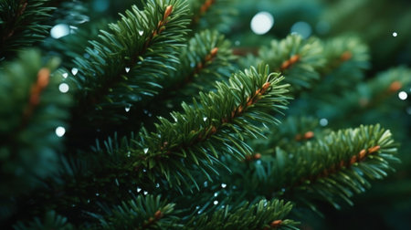 A detailed close-up of a pine branch adorned with glowing bokeh lights and glistening water droplets, set against a soft, misty background.