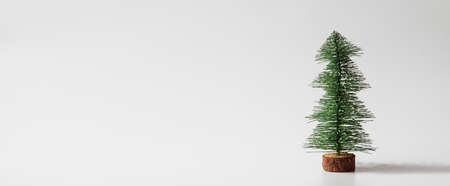 Web Banner Miniature christmas tree on white background with copy space for text. Winter holiday celebration concept.