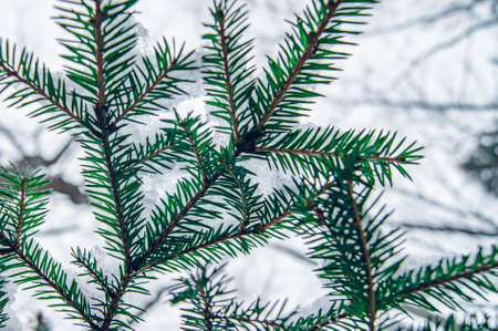A branch of spruce in winter. Pine needles in the winter forest. Wildlife. The green color penetrates through the gray and cold winter. The stylized treatment of the mood.