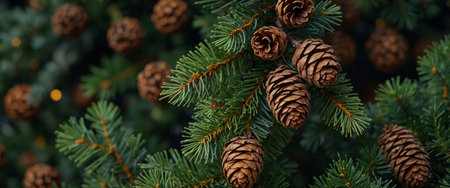 AI Generated. Christmas Fir tree branches and pine cones background