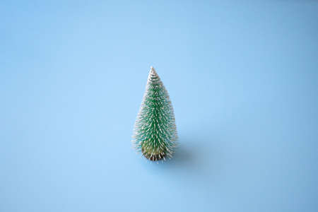 Green Christmas tree on blue pastel background new year holiday celebration concept