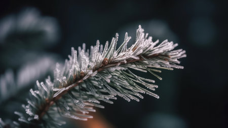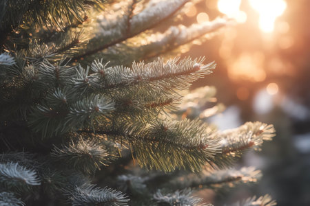 Christmas tree branches in hoarfrost with a blurred background.