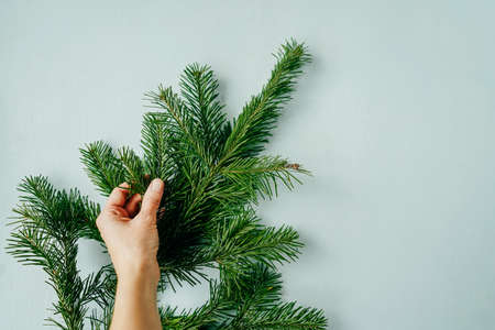 Christmas fir tree blue background with copy space. Fir tree branches texture.