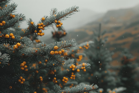 A close up of a pine tree with snow on it, AI